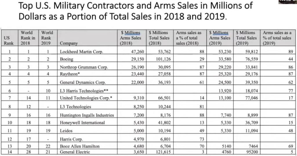 Check the screenshot below from Neta Crawford’s presentation to see the top US military industrial players and their arms sales as a total percentage of company sales.