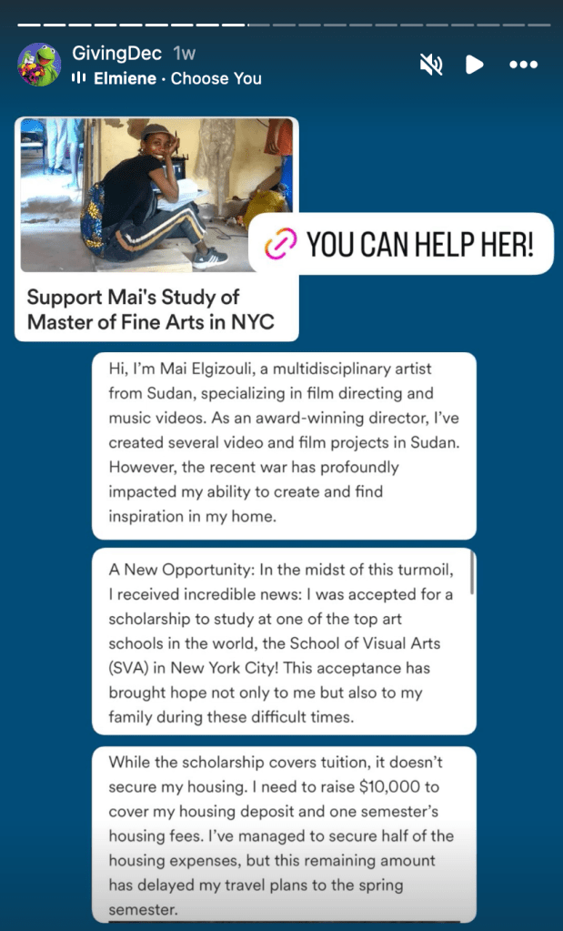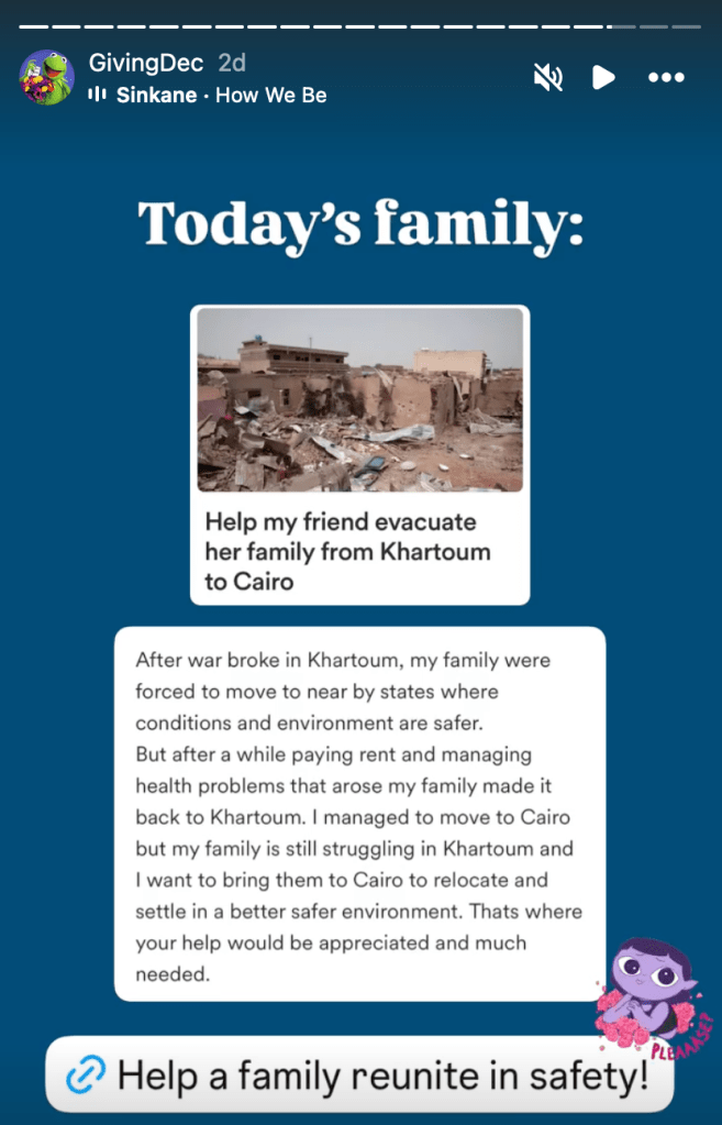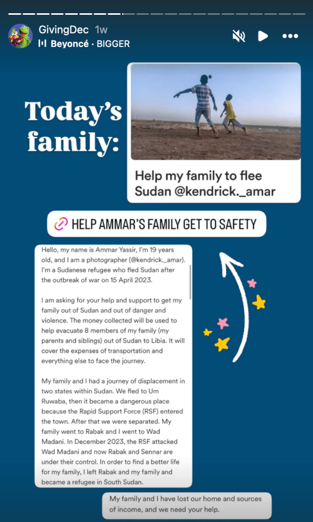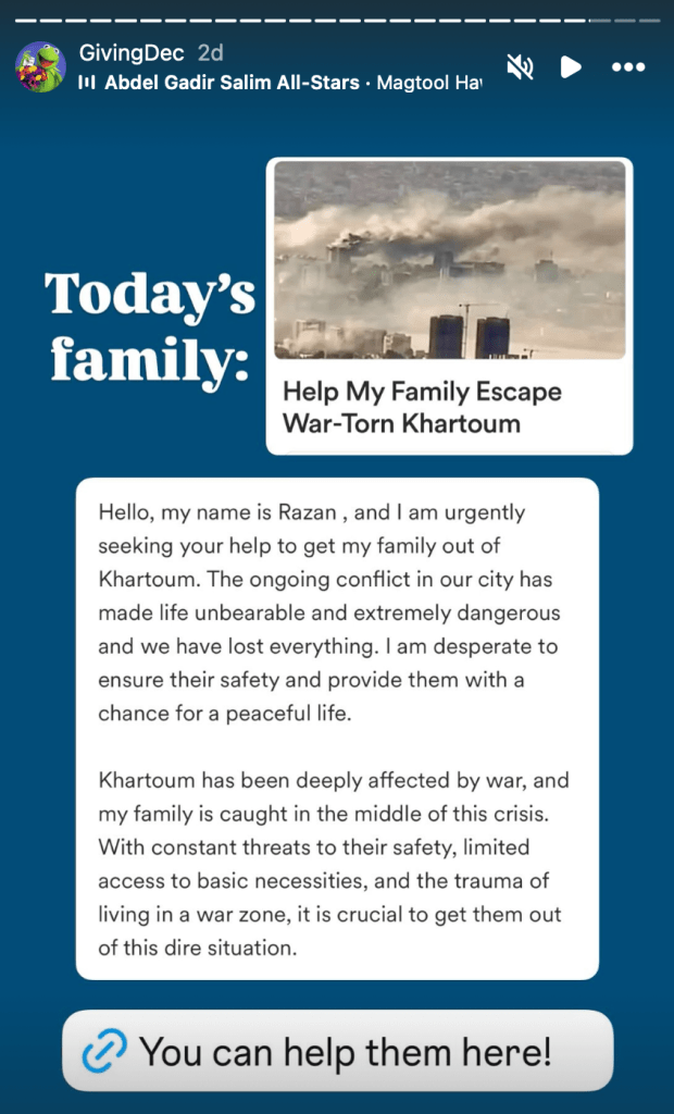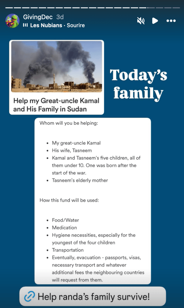 This December, she’s devoting her social media channels to raise funds for individual Sudanese families enduring the worst humanitarian crisis ever recorded. When I asked her why she’s doing this, she said, “There are just so many families in need, and they’re completely invisible. I wanted to help get their campaigns some visibility while also illustrating just how dire the situation is in Sudan.”