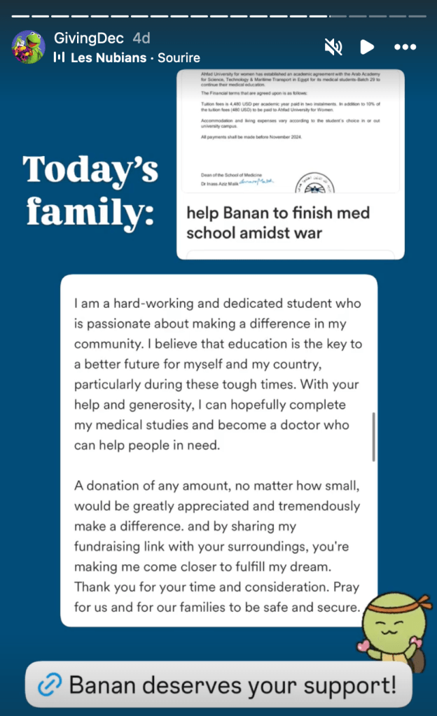 Banan is a fifth year medical student with a heart to serve her community. Her school closed when the war broke out. After multiple displacements, Banan and some family members found safety in Egypt. There, she registered as a refugee with the UNHCR and enrolled to resume medical studies. The displacement and evacuation wiped out all their family savings, so she needs help to continue her studies. (US Dollars)