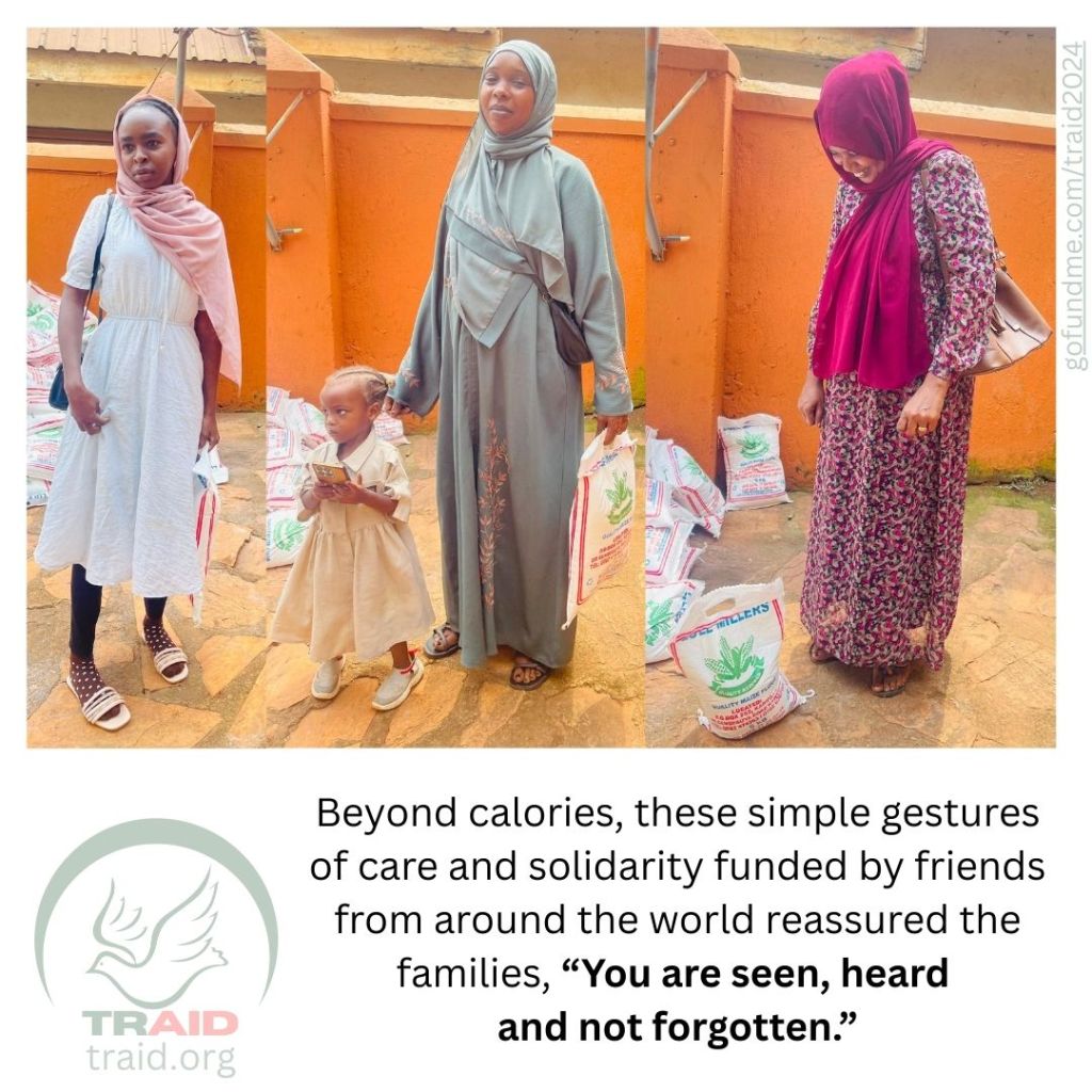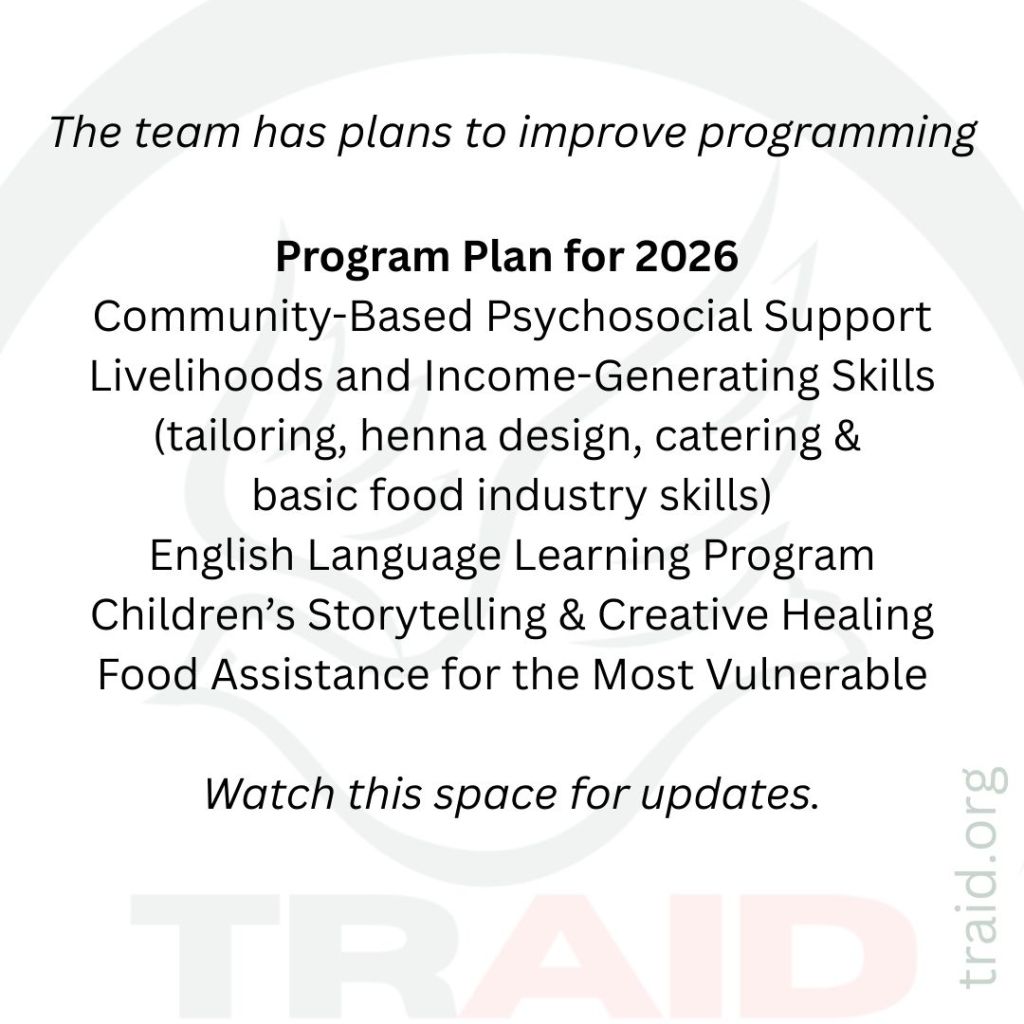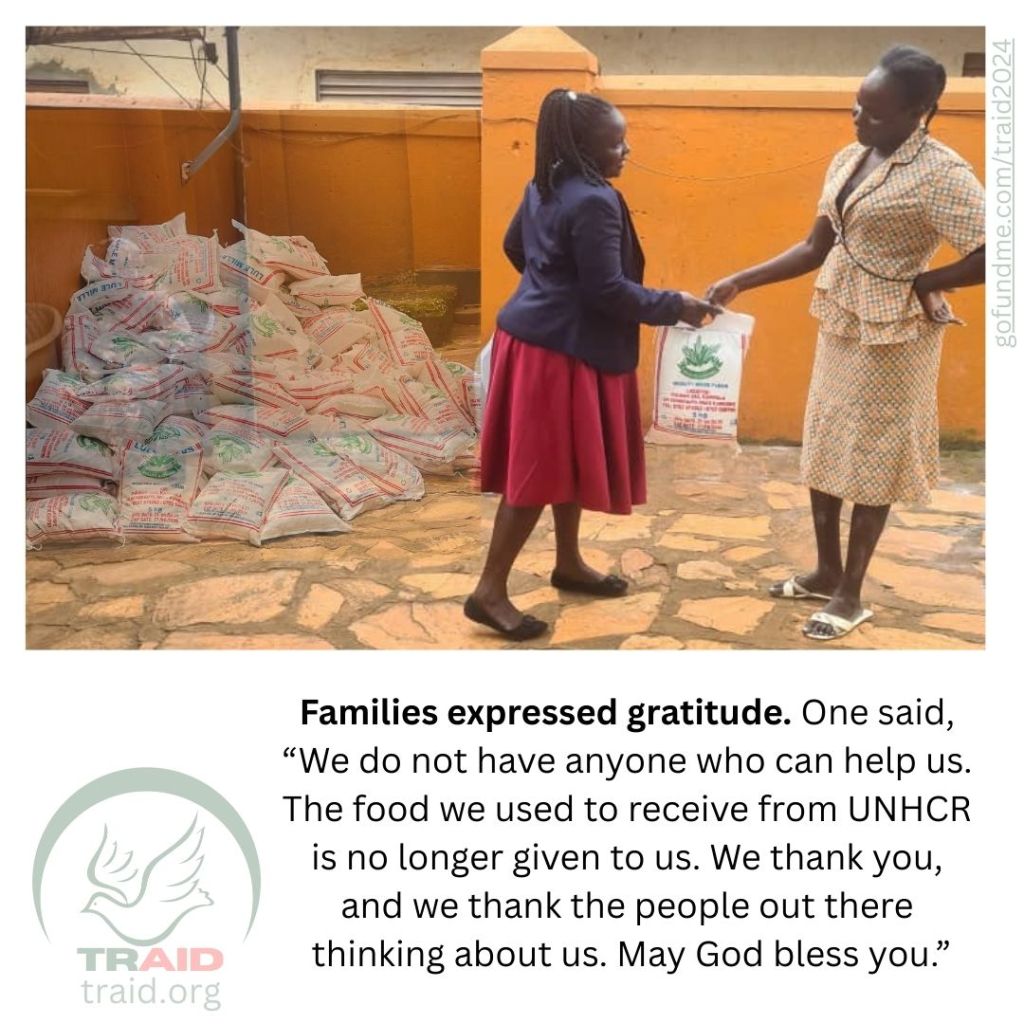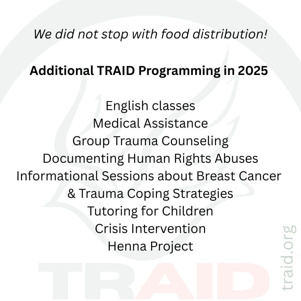 We continue to fundraise and hope to raise an additional $1,742 by the end of January for February’s food distribution. We welcome your one-time or monthly contribution of whatever you can afford on GoFundMe, PayPal, or Venmo @ TRAID2024.
