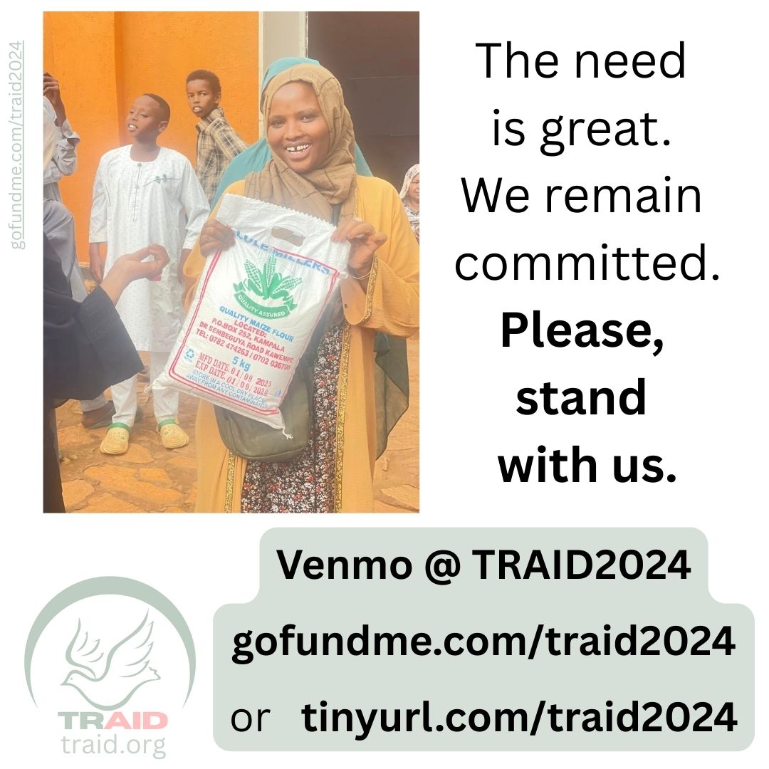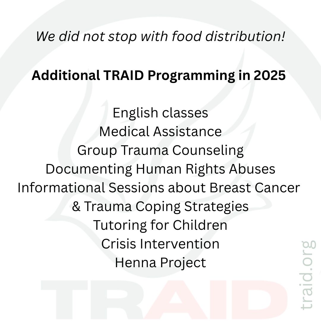 We continue to fundraise and hope to raise an additional $1,742 by the end of January for February’s food distribution. We welcome your one-time or monthly contribution of whatever you can afford on GoFundMe, PayPal, or Venmo @ TRAID2024.