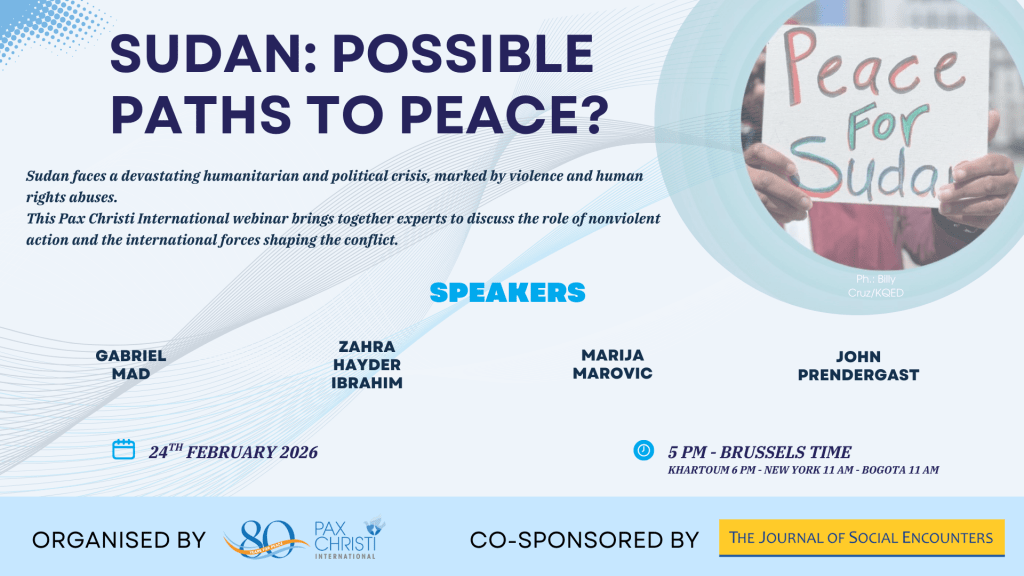 On February 24th, 2026 at 5 pm Brussels time, Pax Christi International, in co-sponsorship with The Journal of Social Encounters, invited participants to a timely and urgent conversation: “Sudan: Possible Paths to Peace?”. Over the past years, Sudan has endured one of the most severe humanitarian and political crises in the world, its suffering too often overlooked by the global community even as displacement, human rights violations and violence continue to escalate.